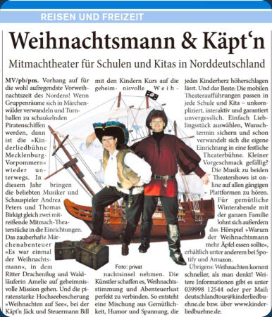 PIRATENWEIHNACHTOft sind es die kleinen Dinge, die anderen Freude bereiten. So erleben das auch der waschechte Piratenkapitän Käpt´n Jack und sein Steuermann Bill auf ihrem Hochseeabenteuer »Weihnachten auf SEE«. Doch zuvor muss das Weihnachtsfest ordentlich vorbereitet werden und dabei läuft zunächst nicht alles nach Plan. Als dann auch noch eines der wichtigsten Utensilien auf ihrem Piratenschiff verschwindet, müssen sie eine Entscheidung treffen, die auf dem Meer sehr gefährlich sein kann, aber nur so können sie die Weihnachtsinsel rechtzeitig zum Fest erreichen.Eine turbulente, musikalische Weihnachtsreise voller Spaß, Spannung und Herz – ideal für Kinder im Kita- und Grundschulalter. + Interaktive Mitmach-Shows+ Empfohlen für Vor- und Grundschulkinder+ Flexible Spieldauer ca. 45 Minuten+ Geeignet für Kitas, Grundschulen und Freilichtbühnen